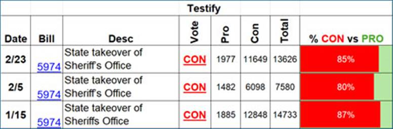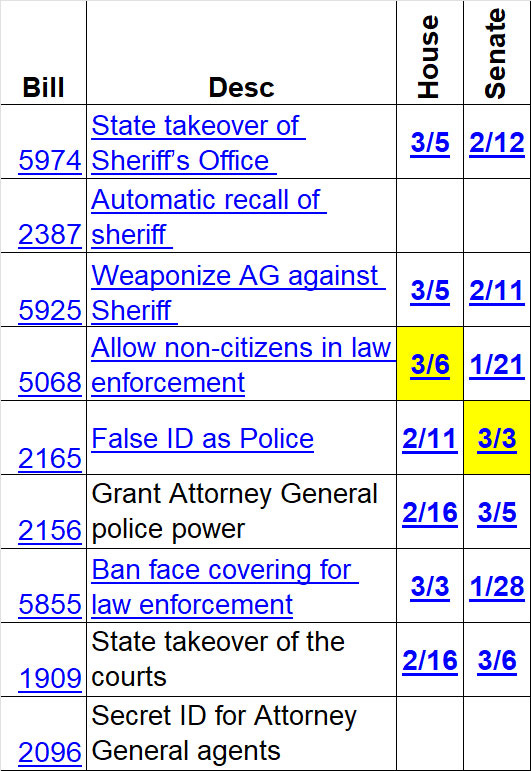 In addition to SB 5974 there have been numerous other bills filed to invade and take over our sheriff’s office. These are some examples. Yellow means Republicans voted for it.